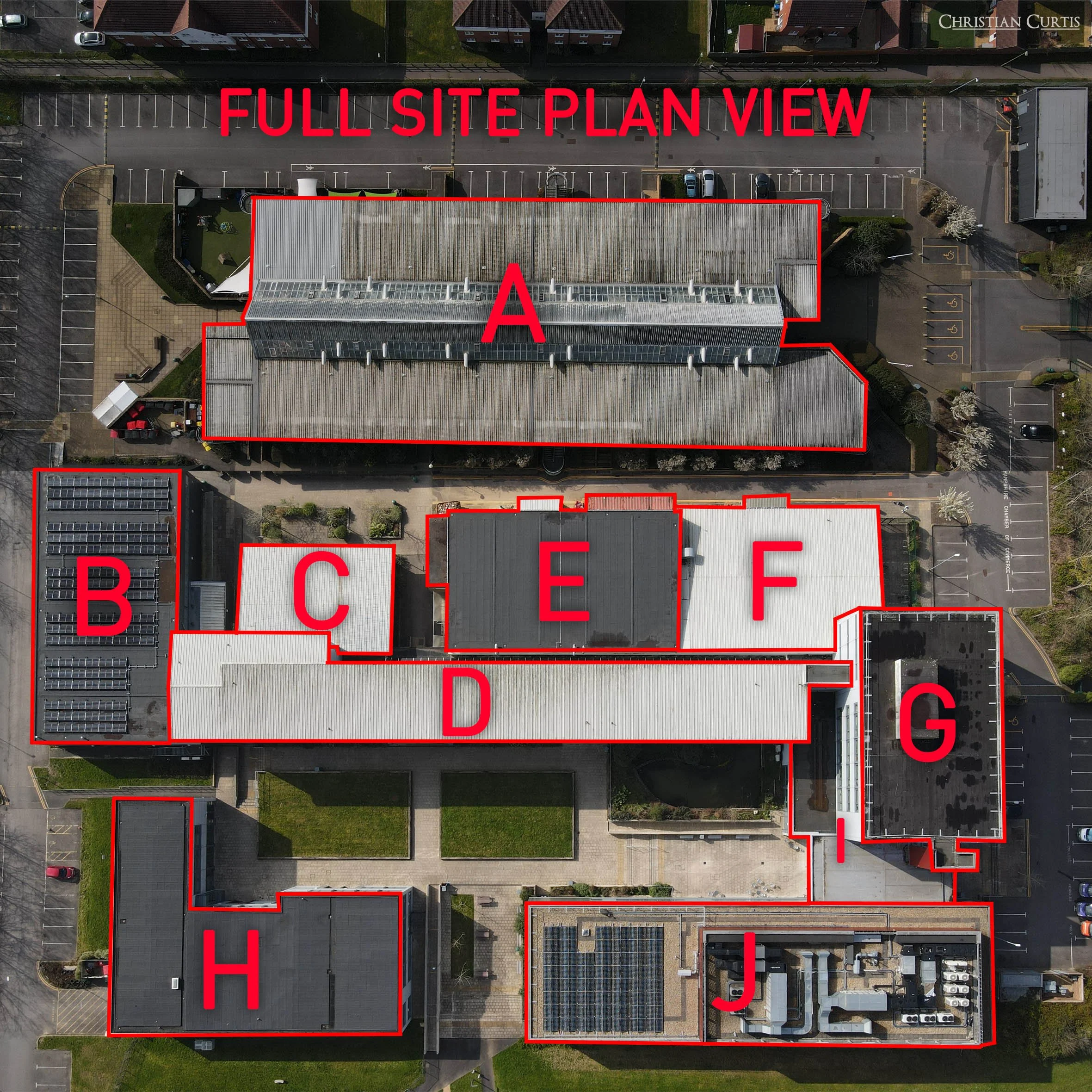 We’ve worked with contractors to provide drone inspections and surveys for large commercial factories, as well as a roof inspection for Fareham College where we created a site map, shown on the left, and provided a detailed summary of the areas of concern each building.